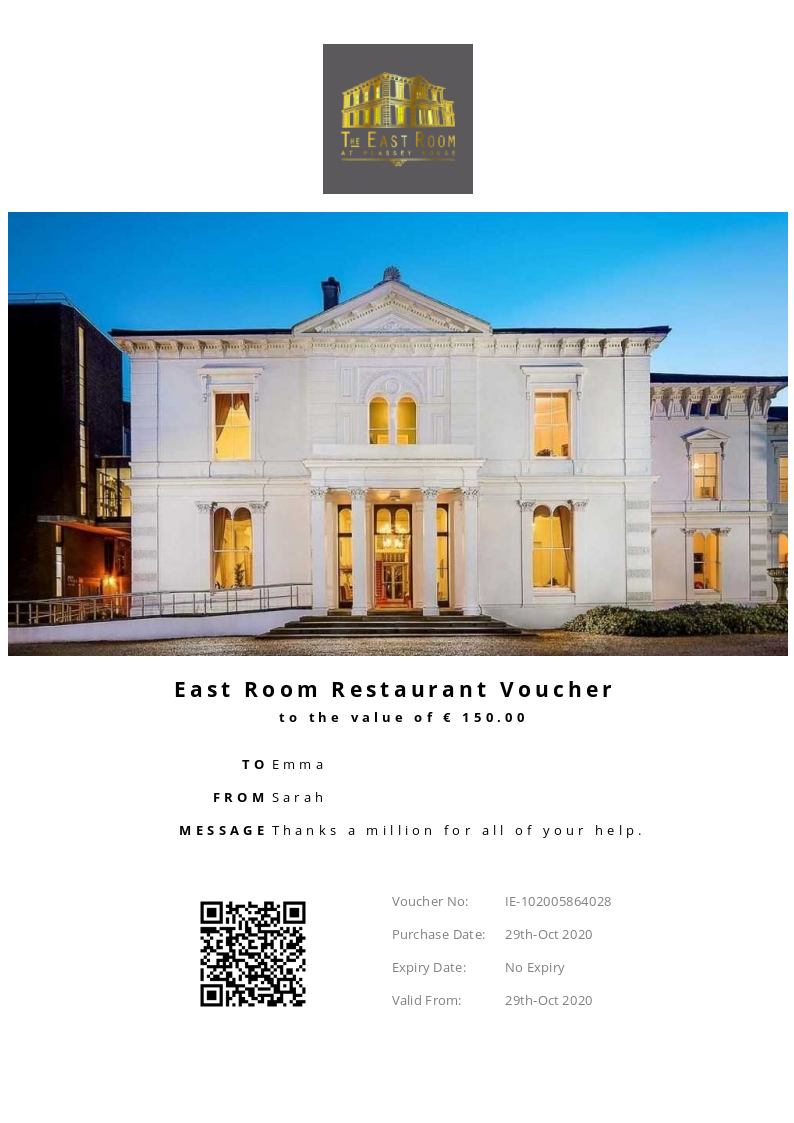 East Room Restaurant allows you to purchase instantly printable gift vouchers, special offers and tickets using the Voucher Connect platform.